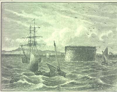 To guard against a possible French invasion at the time of the Napoleonic wars towers were modelled on the original at Mortella Point in Corsica were built at strategic points around the east coast. One was constructed on mussel Cape Rock at the mouth of the harbour in 1807/9 at the cost of 17,000 pounds. Migrant labourers may have been used for carvings on the stonework describe Irish Folk Symbols.