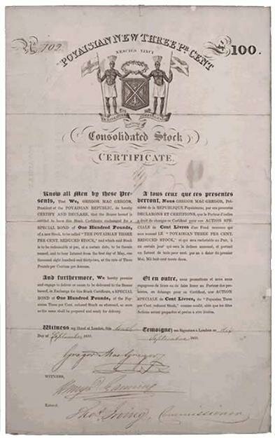 Know all Men by these Presents, That We, GREGOR MAC GREGOR, President of the POYAISIAN REPUBLIC, do hereby CERTIFY AND DECLARE, that the Bearer hereof is entitled to have this Stock Certificate exchanged for a SPECIAL BOND of One Hundred Pounds, of a new Stock, to be called “THE POYAISIAN THREE PER CENT. REDUCED STOCK”, and which said Stock is to be redeemable at par, at a certain date, to be therein named, and to bear Interest from the first day of May, one thousand eight hundred and thirty-two, at the rate of Three Pounds per Centum per Annum.