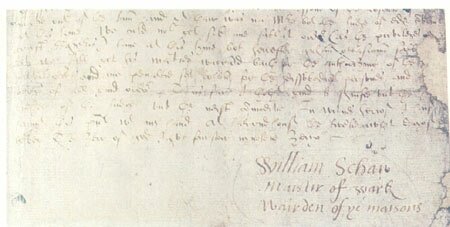 The signature appears at the bottom of the “Schaw Statute” of 1599. It was Schaw who laid down the statutes of Scottish Freemasonary and was a close friend of David Lindsay the first Protestant minister of South Leith Parish Church