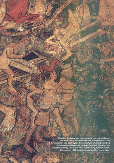 For centuries the only drink available for most people was beer or wine (available to the rich) and beer making was considered one of the wifely duties in Leith. However to water it down was considered a crime. This picture shows wifes who did this being ushered into hell. From the Coventry Doom Fresco in the Holy Trinity Church Coventry c1435