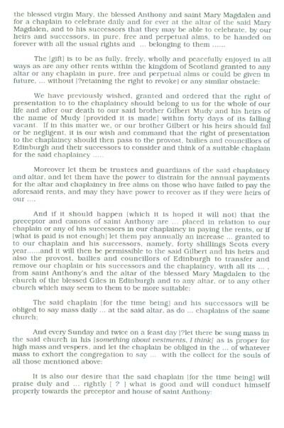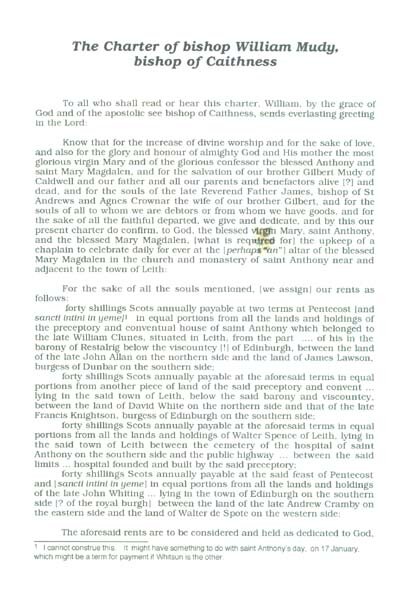 The Preceptory of St Anthony stood on what is now the Church Halls of South leith Parish Church. It was destroyed during the Siege of Leith in 1560 however over a period of some two hundred years it developed into one of the largest churches in Scotland unfortunately nothing remains of it today. The hospital of the preceptory later became Trinity House. This is a English translation of the Charter from the Latin.