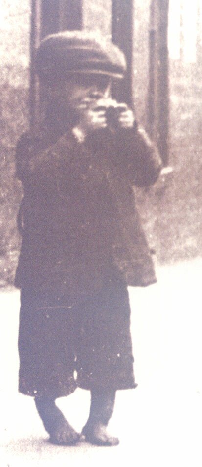 This child has been disfigured by rickets once common in Leith in the 19th and early 20th century. This was caused by a poor diet and vitamin D deficiency. Much of the work on this was done at Edinburgh and Glasgow University and led to milk being given to children at school which gradually made the disease unknown in Scotland.